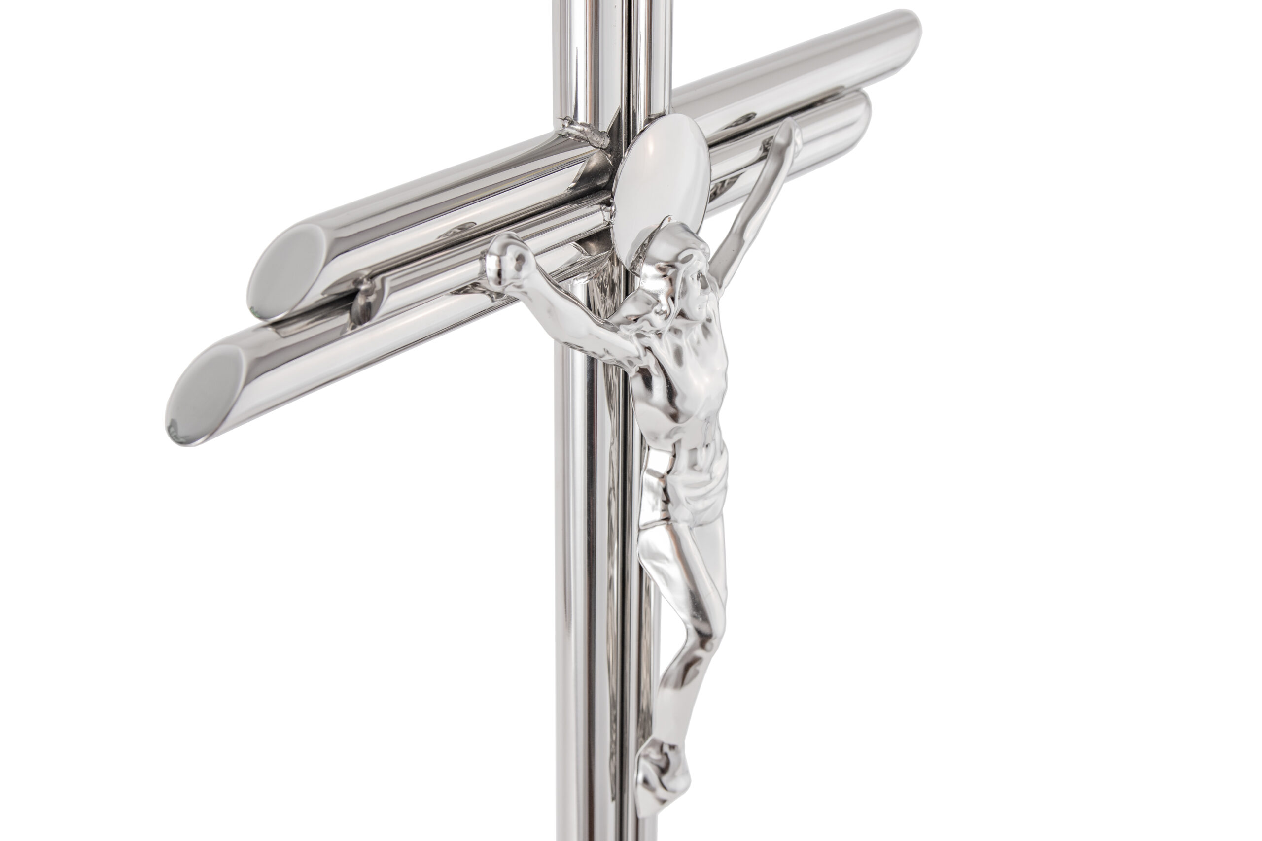 Krzyż stojący z trzech rurek wykonany ze stali nierdzewnej, polerowany.