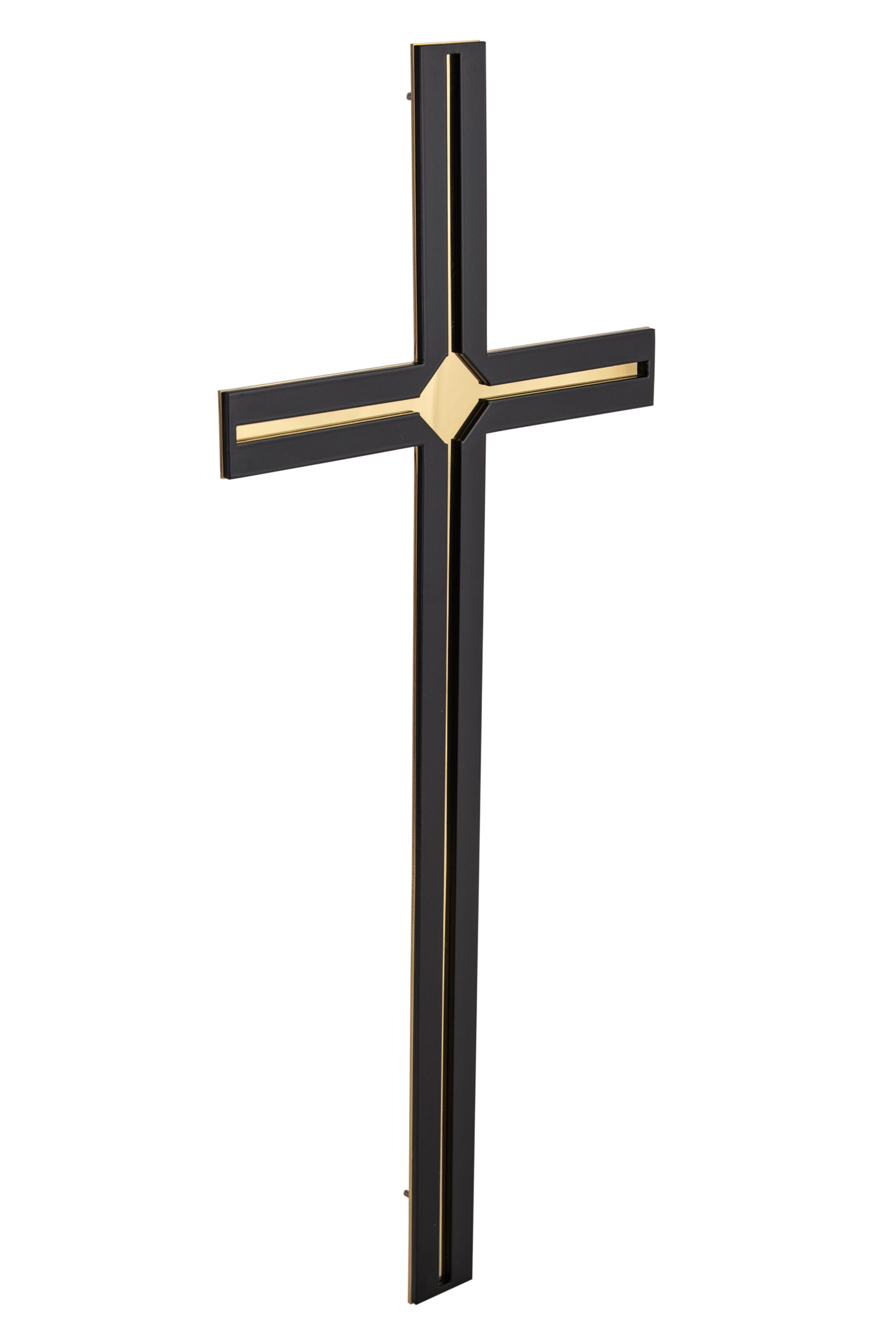 Krzyż wiszący ze stali nierdzewnej podwójna blacha mix. Kolor czarny to efekt malowania proszkowo, kolor złoty uzyskiwany podczas złocenia gdzie zachodzi reakcja chemiczna.