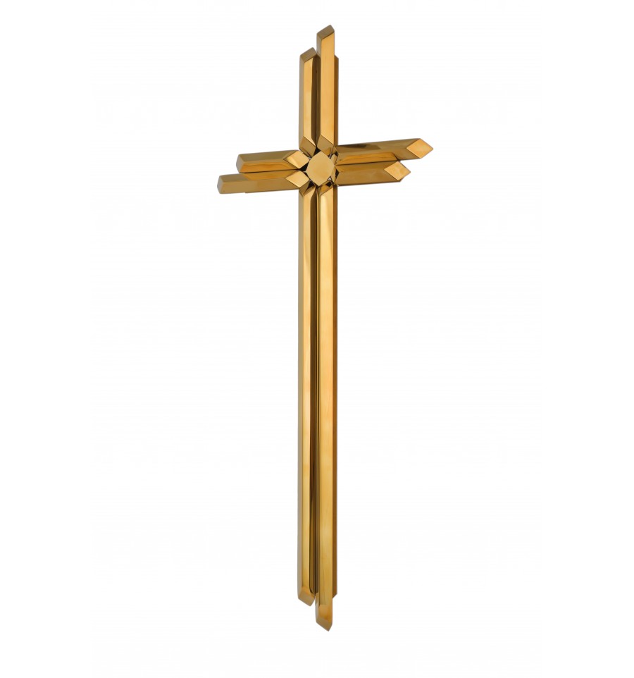 Krzyż przestrzenny, wiszący wykonany z kwasówki, polerowany. Kolor uzyskiwany jest poprzez reakcje chemiczną, która wchodzi wgłąb materiału. Dzięki temu kolor nie łuszczy się, nie schodzi oraz w momencie porysowania nie widać koloru srebrnego.