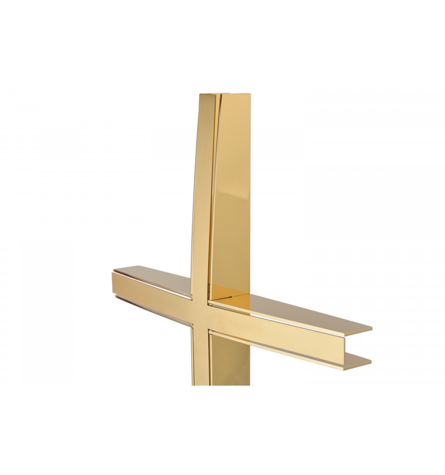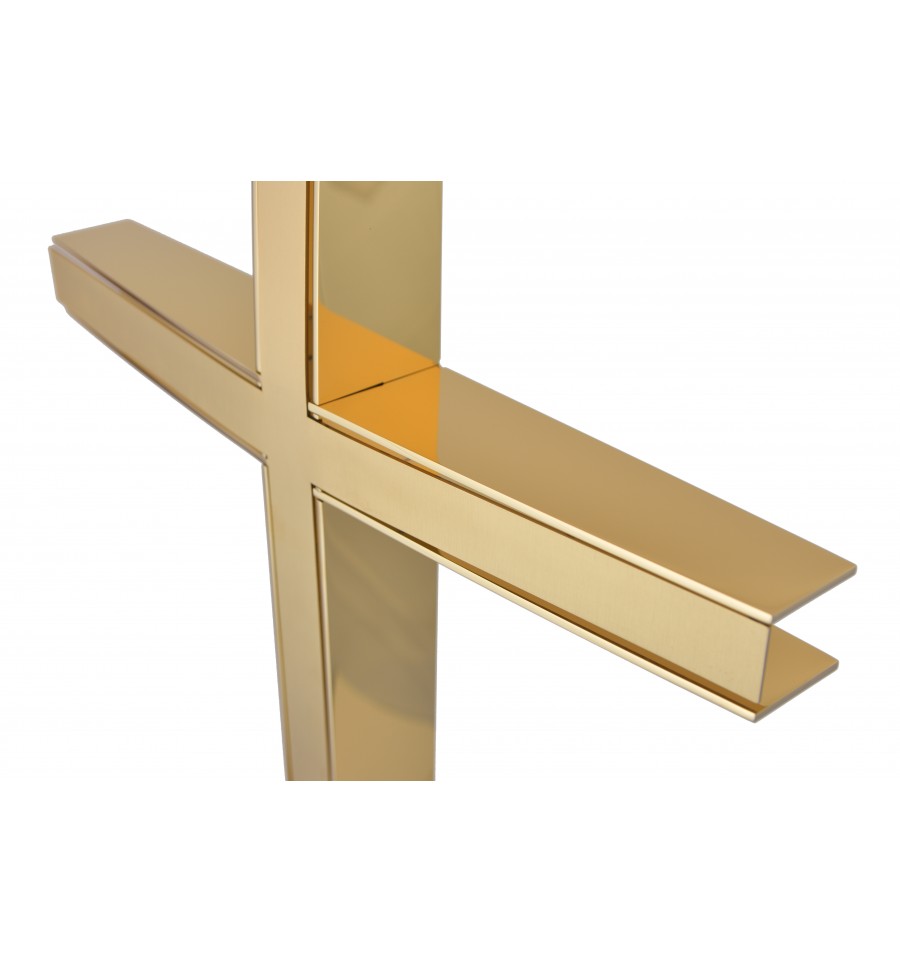 Krzyż stojący ze stali nierdzewnej satynowy. Kolor uzyskiwany jest poprzez reakcje chemiczną, która wchodzi wgłąb materiału. Dzięki temu kolor nie łuszczy się, nie schodzi oraz w momencie porysowania nie widać koloru srebrnego.